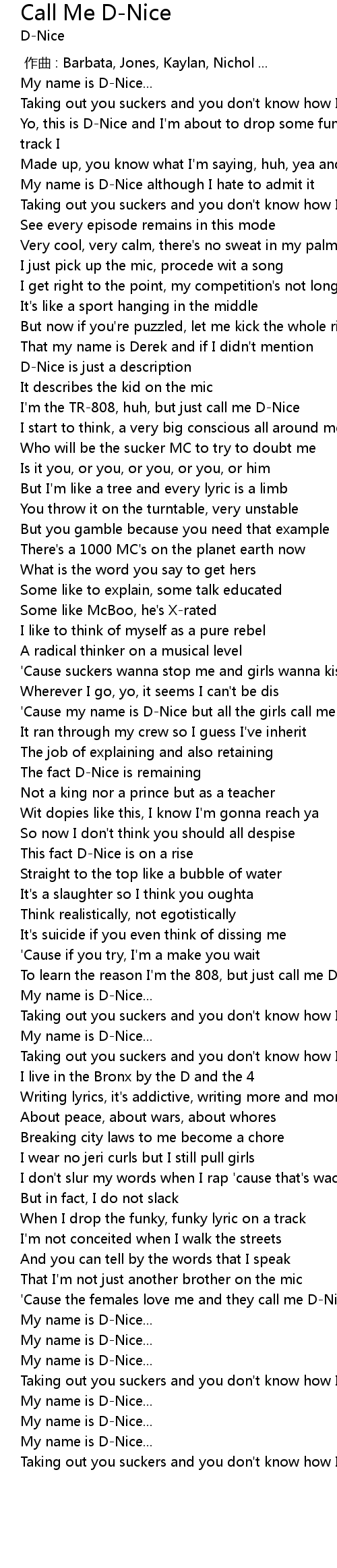 | [00:10.51] | Yo, this is D-Nice and I'm about to drop some funky lyrics on this track I |