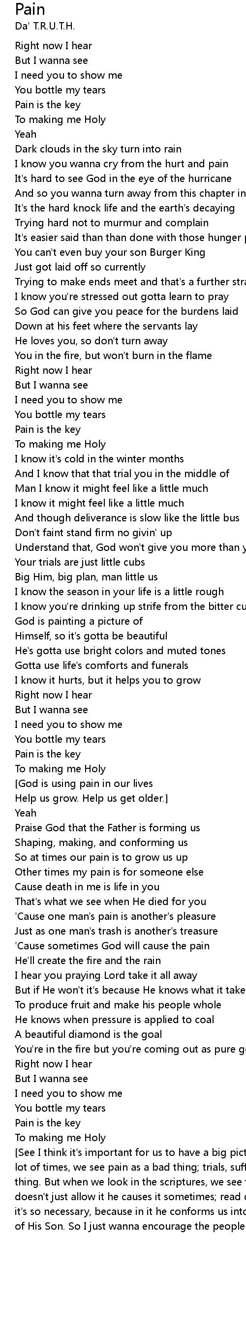 [See I think it's important for us to have a big picture perspective on pain. A lot of times, we see pain as a bad thing; trials, suffering, you see it as a bad thing. But when we look in the scriptures, we see that God prescribes pain. He doesn't just allow it he causes it sometimes; read deuteronomy chapter 8. But it's so necessary, because in it he conforms us into the image and the likeness of His Son. So I just wanna encourage the people of God, please understand that God is using your pain for His own glory.] |