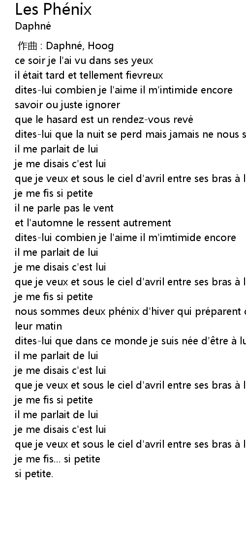 | [02:20.78] | nous sommes deux phé nix d' hiver qui pré parent chaque nuit |