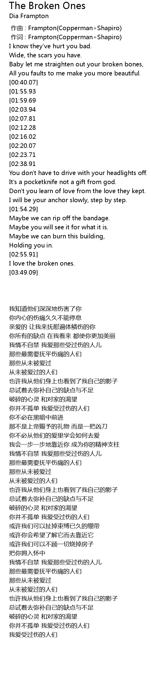 | [03:24.62][02:23.71][01:10.30] | No you' re not alone, I love the broken ones. |
