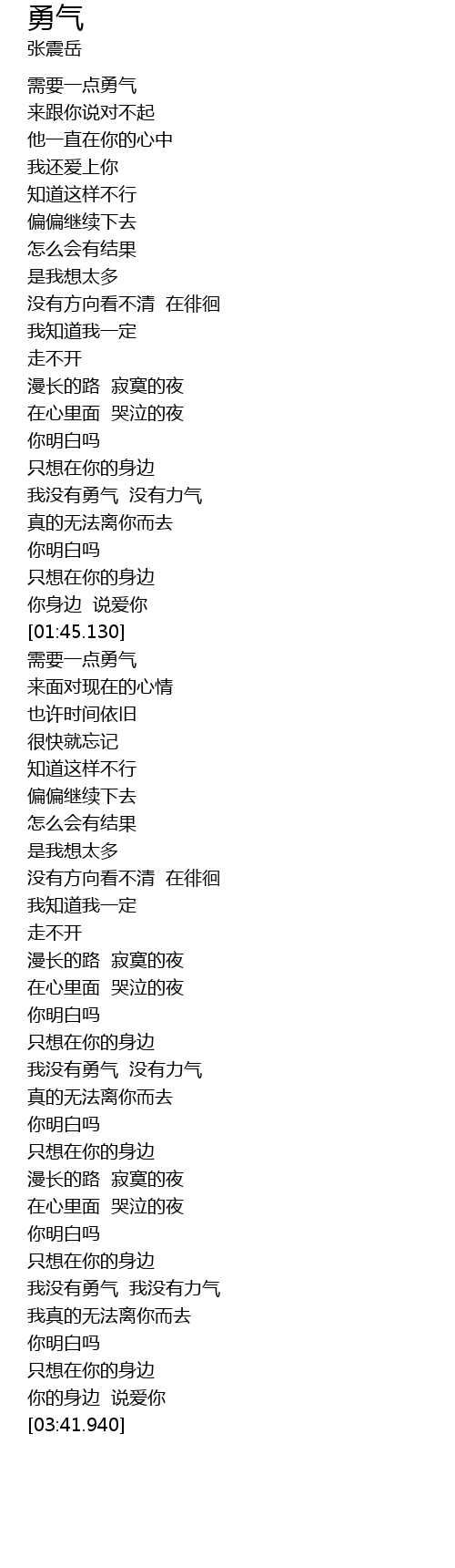 | [03:22.410] | wǒ méi yǒu yǒng qì wǒ méi yǒu lì qì |