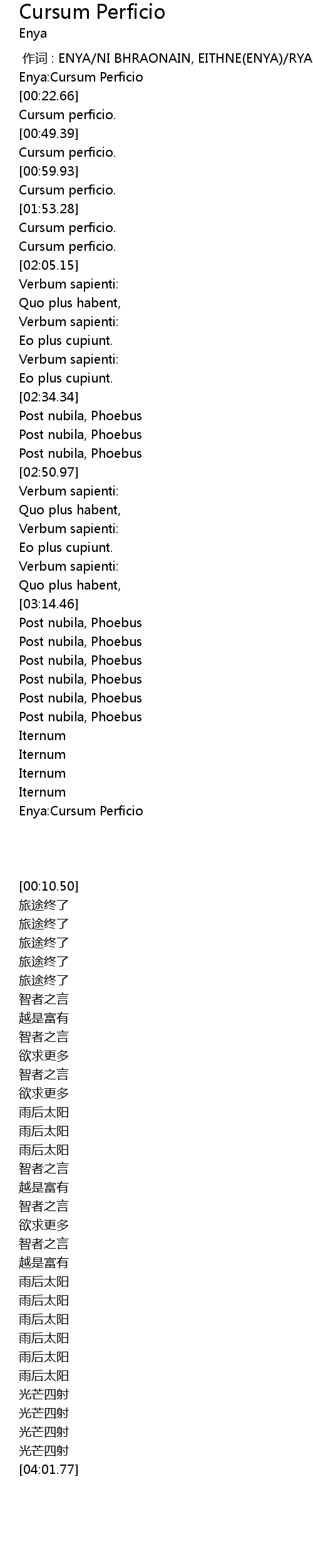 | [00:00.00] | 作词 : ENYA/NI BHRAONAIN, EITHNE(ENYA)/RYAN, NICKY/RYAN, ROMA |