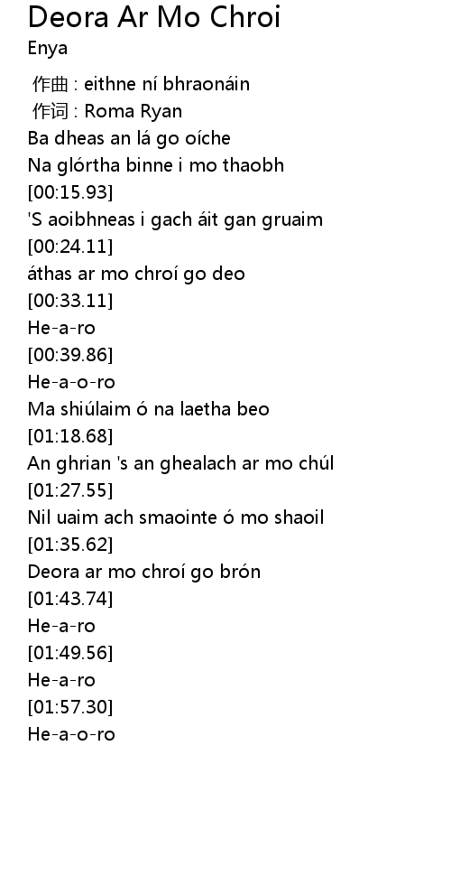 | [01:38.99] | Deora ar mo chroí go brón |