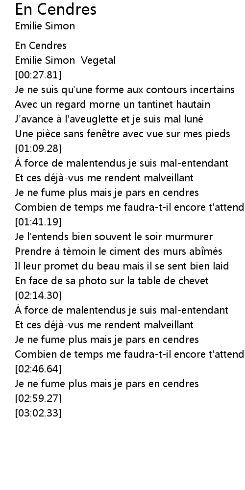 | [02:35.94] | Je ne fume plus mais je pars en cendres |