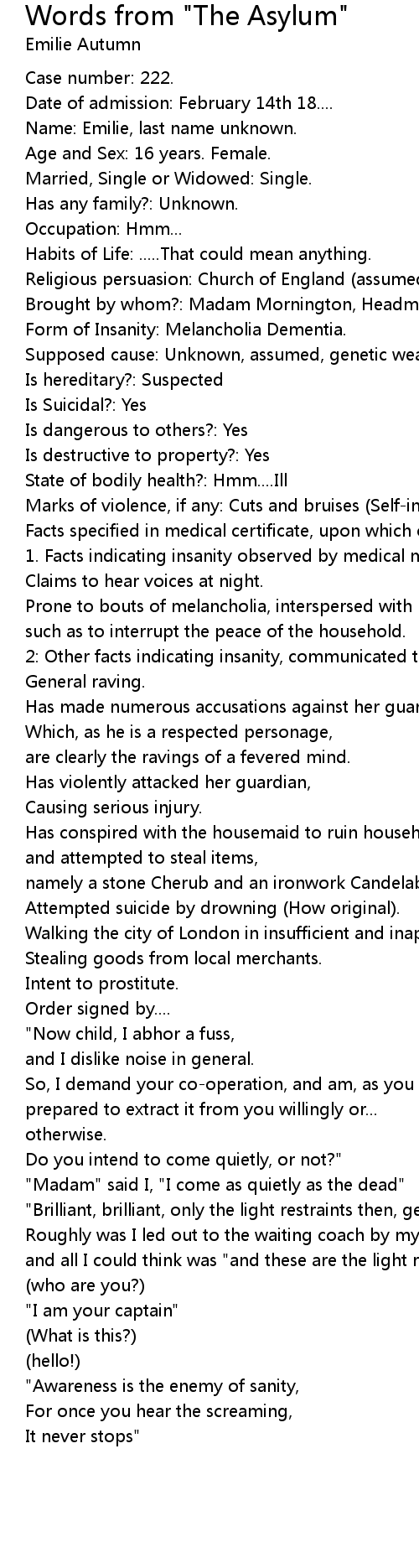 Brought by whom?: Madam Mornington, Headmistress, Asylum, FWVG. |