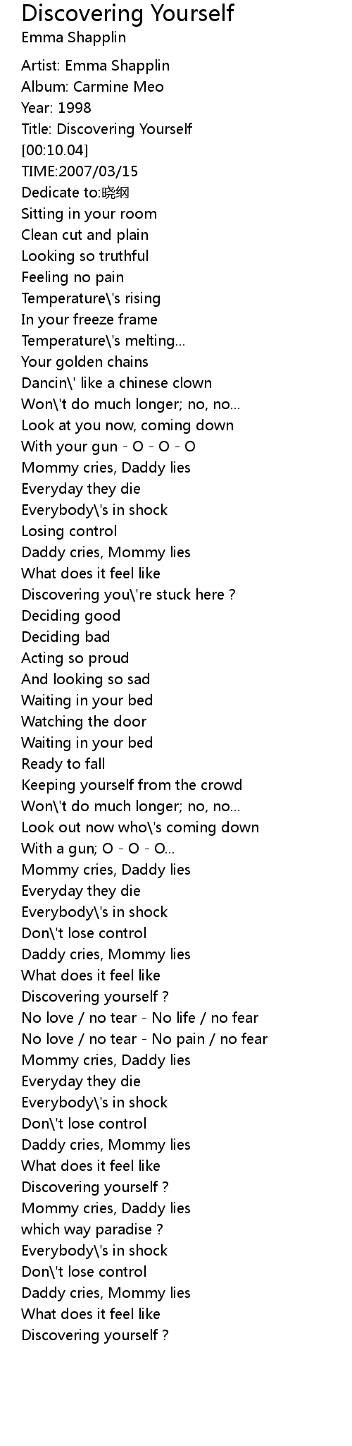 | [02:34.95] | Daddy cries, Mommy lies |
