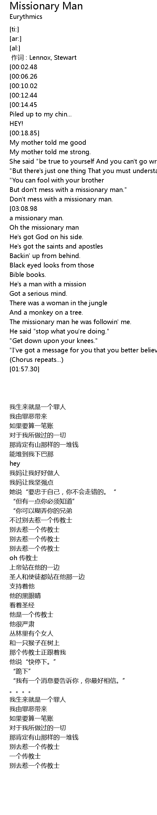 | [03:28.18][03:08.98][00:59.79][00:55.94] | Don't mess with a missionary man. |
