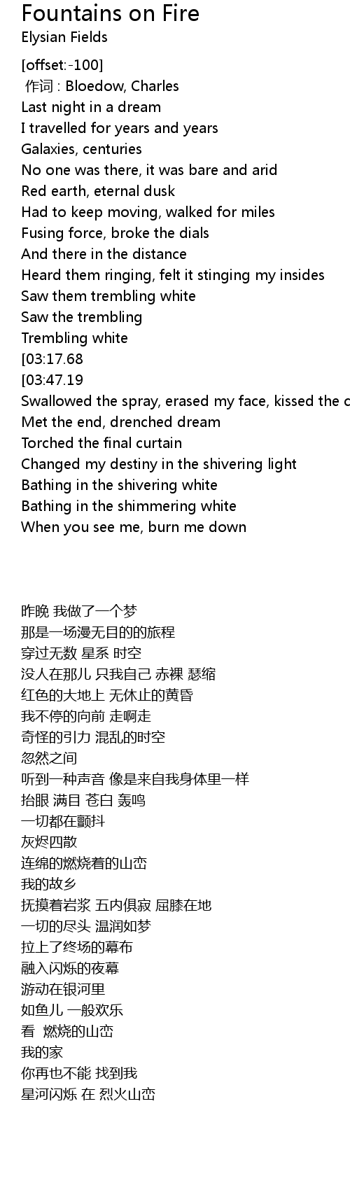 | [01:52.03][03:17.68][06:07.51] | Fountains on fire |