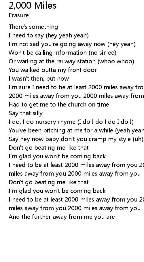 | I'm sure I need to be at least 2000 miles away from you 2000 miles away from you 2000 miles away from you 2000 miles away from you | |