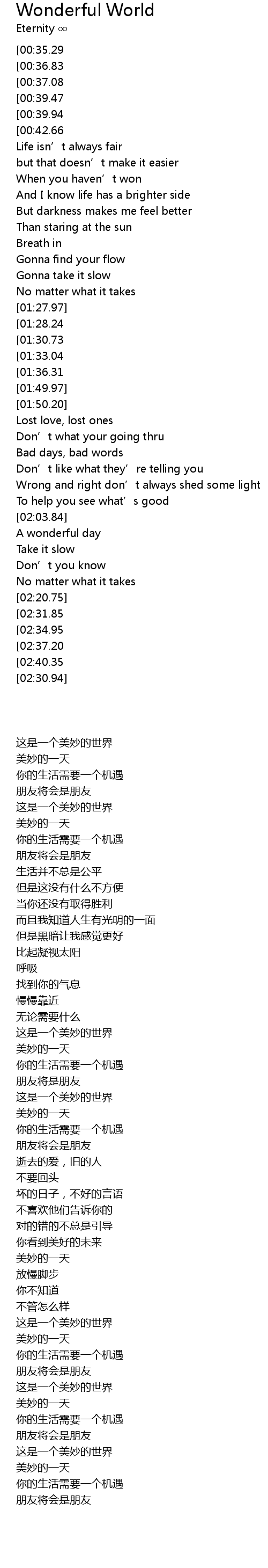 | [02:54.91][02:31.85][02:21.26] | It' s a wonderful world |