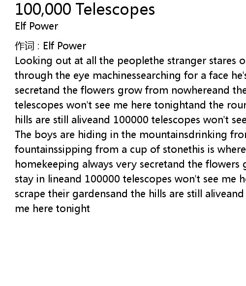 | Looking out at all the peoplethe stranger stares out from the steeplegazing through the eye machinessearching for a face he' s never seenkeeping always very secretand the flowers grow from nowhereand the monsters stay in lineand 100000 telescopes won' t see me here tonightand the roundmen scrape their gardensand the hills are still aliveand 100000 telescopes won' t see me here tonight | |