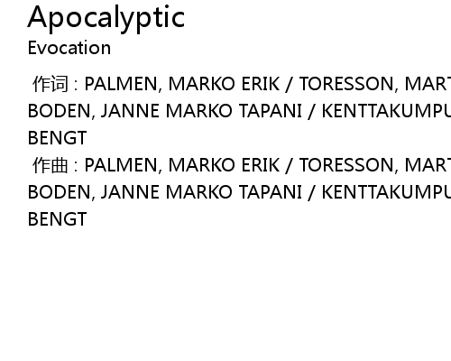 | [00:00.000] | zuò cí : PALMEN, MARKO ERIK TORESSON, MARTIN PELLE KENTTAEKUMPU BODEN, JANNE MARKO TAPANI KENTTAKUMPU, VESA VEIKKO JUHANI JOSEFSSON, THOMAS BENGT |