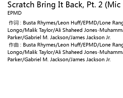 | [00:00.000] | 作曲 : Busta Rhymes/Leon Huff/EPMD/Lone Ranger/Kenneth Gamble/Joey Longo/Malik Taylor/Ali Shaheed Jones-Muhammad/Bryan Higgins/Lawrence Krsone Parker/Gabriel M. Jackson/James Jackson Jr. |
