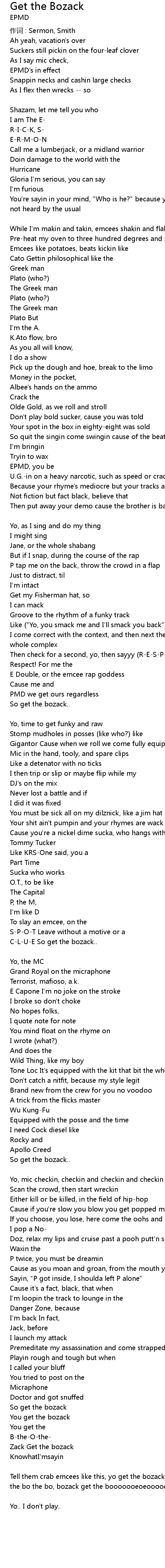 | Tell them crab emcees like this, yo get the bozack, get the bozack get the bo the bo the bo, bozack get the booooooeoeooooeeohzack get the booooooeoeooooeeohzack [Parrish Smith] | |