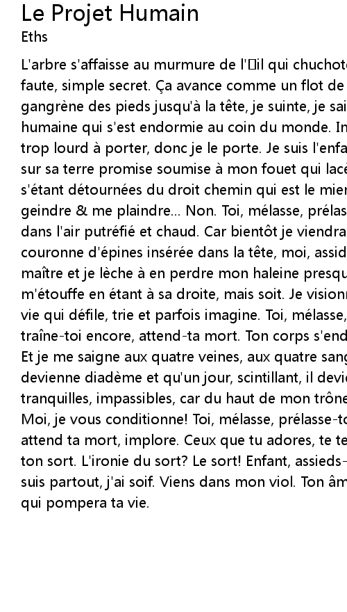 | L' arbre s' affaisse au murmure de l' il qui chuchote a la bouche, offense, faute, simple secret. a avance comme un flot de me thane. Empourprant ma gangre ne des pieds jusqu'a la t te, je suinte, je saigne, pour vous ma race humaine qui s' est endormie au coin du monde. Immonde est le reflet du pe che trop lourd a porter, donc je le porte. Je suis l' enfant choisi, conquit, ne sur sa terre promise soumise a mon fouet qui lace re les chairs perdues s'e tant de tourne es du droit chemin qui est le mien. Veuxtu encore m' entendre geindre me plaindre... Non. Toi, me lasse, pre lassetoi, tra netoi encore dans l' air putre fie et chaud. Car bient t je viendrais vous sauver. Ma couronne d'e pines inse re e dans la t te, moi, assidue, j' obe is au grand ma tre et je le che a en perdre mon haleine presque morte, je suffoque, je m'e touffe en e tant a sa droite, mais soit. Je visionne comme un film chaque vie qui de file, trie et parfois imagine. Toi, me lasse, pre lassetoi, tra netoi encore, attendta mort. Ton corps s' endort dans ma venue indolore. Et je me saigne aux quatre veines, aux quatre sangs, pour que mon aure ole devienne diade me et qu' un jour, scintillant, il devienne bien brillant. Dormez tranquilles, impassibles, car du haut de mon tr ne, moi, je vous conditionne. Moi, je vous conditionne! Toi, me lasse, pre lassetoi, tra netoi encore, attend ta mort, implore. Ceux que tu adores, te tendent la main et te laisse a ton sort. L' ironie du sort? Le sort! Enfant, assiedstoi contre moi, en moi. Je suis partout, j' ai soif. Viens dans mon viol. Ton me prend feu. Je suis celui qui pompera ta vie. |