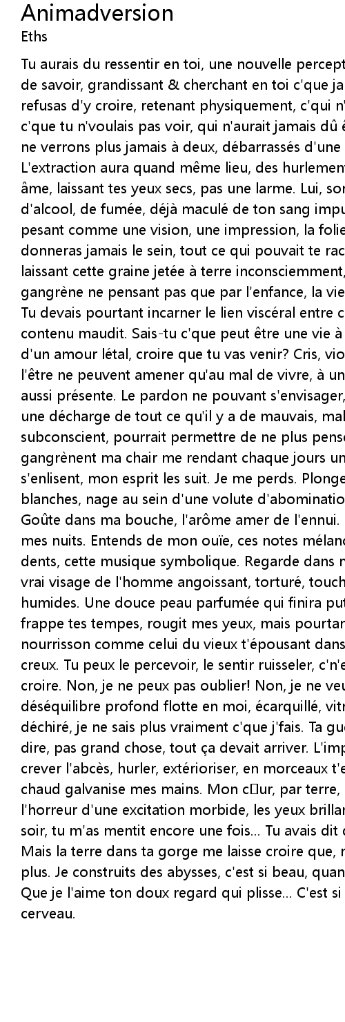 | Tu aurais du ressentir en toi, une nouvelle perception, un nouveau regard, avide de savoir, grandissant cherchant en toi c' que jamais il ne trouvera. Tu refusas d' y croire, retenant physiquement, c' qui n' avait pas sa place en toi, c' que tu n' voulais pas voir, qui n' aurait jamais d tre la. tre la. Nous ne verrons plus jamais a deux, de barrasse s d' une incision a la lame. L' extraction aura quand m me lieu, des hurlements stridents emplissant ton me, laissant tes yeux secs, pas une larme. Lui, sorti de cet antre impre gne e d' alcool, de fume e, de ja macule de ton sang impur, sa premie re sensation se pesant comme une vision, une impression, la folie derrie re les murs. Tu ne lui donneras jamais le sein, tout ce qui pouvait te raccrocher a lui n'e tait rien, laissant cette graine jete e a terre inconsciemment, se de velopper comme la gangre ne ne pensant pas que par l' enfance, la vie d' un tre est de termine e. Tu devais pourtant incarner le lien visce ral entre ce ventre ce leste son contenu maudit. Saistu c' que peut tre une vie a subir, nourrit aux racines d' un amour le tal, croire que tu vas venir? Cris, violence nonrespect de l' tre ne peuvent amener qu' au mal de vivre, a une ranc ur ame re, toujours aussi pre sente. Le pardon ne pouvant s' envisager, seule une vengeance violente, une de charge de tout ce qu' il y a de mauvais, malsain, au plus profond du subconscient, pourrait permettre de ne plus penser aux noirs souvenirs qui gangre nent ma chair me rendant chaque jours un peu plus malade. Mes pieds s' enlisent, mon esprit les suit. Je me perds. Plonge tes mains dans mes larmes blanches, nage au sein d' une volute d' abominations, de laideur, de carnage. Go te dans ma bouche, l' ar me amer de l' ennui. Toutes ces tortures qui hantent mes nuits. Entends de mon ou e, ces notes me lancoliques, mes grincements de dents, cette musique symbolique. Regarde dans mes yeux, une vision trouble e du vrai visage de l' homme angoissant, torture, touche, de mes mains, tes joues humides. Une douce peau parfume e qui finira putride. Ressent ce liquide qui frappe tes tempes, rougit mes yeux, mais pourtant, alimente le c ur du nourrisson comme celui du vieux t'e pousant dans la chair, les bosses, les creux. Tu peux le percevoir, le sentir ruisseler, c' n' est plus la peine de croire. Non, je ne peux pas oublier! Non, je ne veux plus oublier! Un de se quilibre profond flotte en moi, e carquille, vitreux. Je dois tre de chire, je ne sais plus vraiment c' que j' fais. Ta gueule est tume fie e. Que dire, pas grand chose, tout a devait arriver. L' important, au fond, c' est de crever l' abce s, hurler, exte rioriser, en morceaux t' enterrer. Le sang e pais chaud galvanise mes mains. Mon c ur, par terre, emprunte le chemin qui me ne a l' horreur d' une excitation morbide, les yeux brillants, le regard matricide. Ce soir, tu m' as mentit encore une fois... Tu avais dit que tu rentrerais t t. Mais la terre dans ta gorge me laisse croire que, maintenant, tu ne rentreras plus. Je construits des abysses, c' est si beau, quand c' est au fond de la peau. Que je l' aime ton doux regard qui plisse... C' est si beau quand je de fonce ton cerveau. |