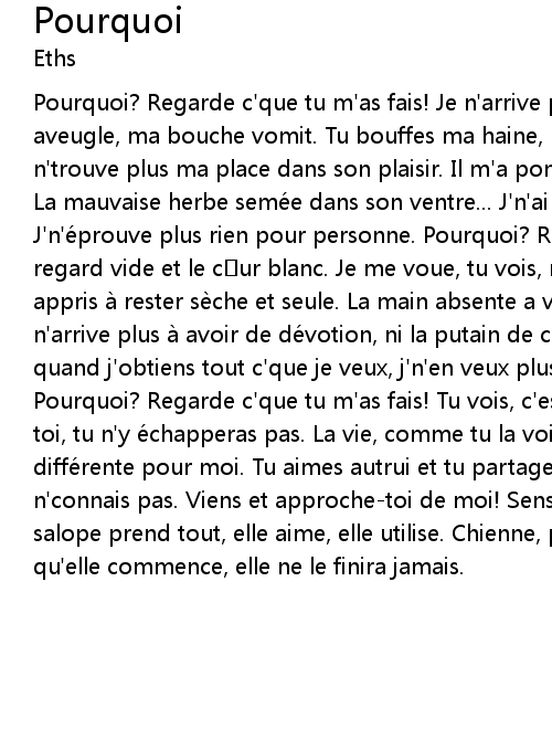 | Pourquoi? Regarde c' que tu m' as fais! Je n' arrive plus à me souvenir. Mes yeux aveugle, ma bouche vomit. Tu bouffes ma haine, mon corps qui pourrit. Je n' trouve plus ma place dans son plaisir. Il m' a pompé e les restes d' innocence. La mauvaise herbe semé e dans son ventre... J' n' ai ni remords ni regret. J' n'é prouve plus rien pour personne. Pourquoi? Regarde c' que tu m' as fais! Le regard vide et le c ur blanc. Je me voue, tu vois, mais fait semblant. J' ai appris à rester sè che et seule. La main absente a volé l'é motion. Je n' arrive plus à avoir de dé votion, ni la putain de cé lè bre affection. Et quand j' obtiens tout c' que je veux, j' n' en veux plus, me lasse, et le dé truis. Pourquoi? Regarde c' que tu m' as fais! Tu vois, c' est plus fort que moi, mais toi, tu n' y é chapperas pas. La vie, comme tu la vois, est, chaque jour, diffé rente pour moi. Tu aimes autrui et tu partages... Je crois que moi je n' connais pas. Viens et approchetoi de moi! Sens l' enfer grandir en moi. La salope prend tout, elle aime, elle utilise. Chienne, pourquoi...? Tout ce qu' elle commence, elle ne le finira jamais. |