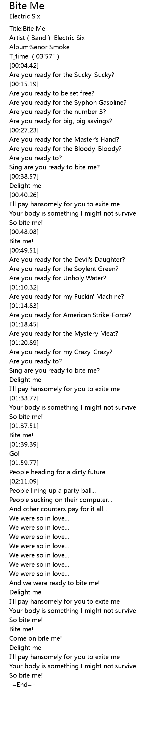 | [01:13.27] | Are you ready for my Fuckin' Machine? |