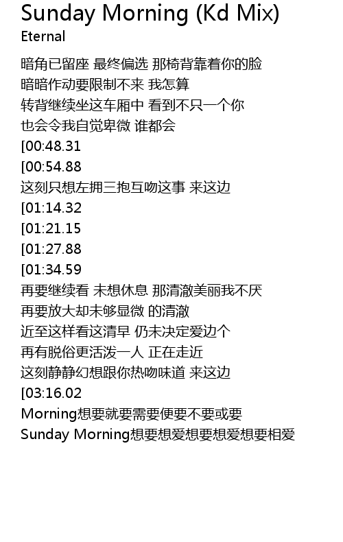 | [03:29.53] | Sunday Morning xiang yao xiang ai xiang yao xiang ai xiang yao xiang ai |