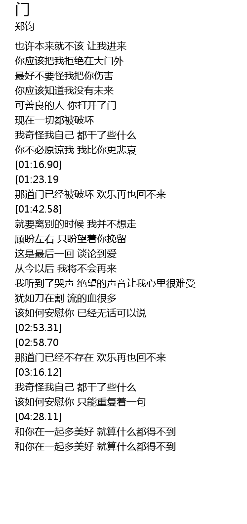 | [04:02.59][01:23.19] | 那道门已经被破坏 欢乐再也回不来 |