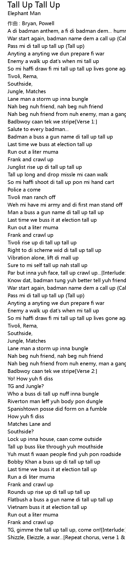 | Badman a buss a gun name di tall up tall up | |