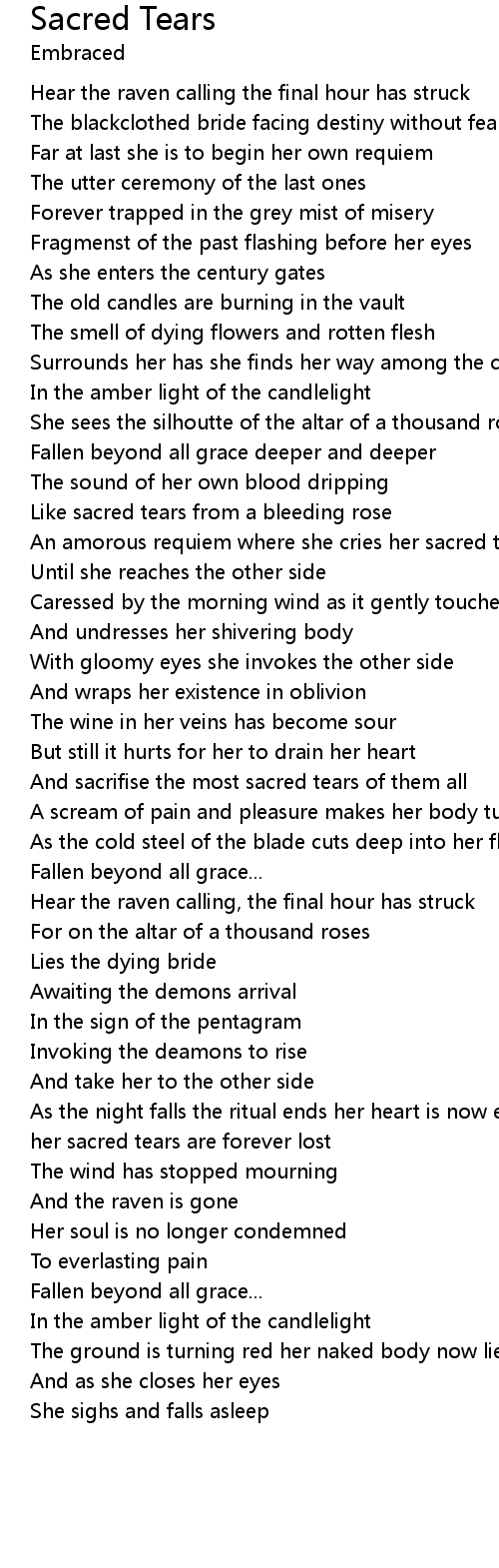 | As the night falls the ritual ends her heart is now empty she is almost asleep her sacred tears are forever lost | |
