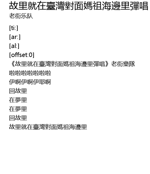 | [00:01.47] | 《故里就在臺灣對面媽祖海邊里彈唱》老街樂隊 |