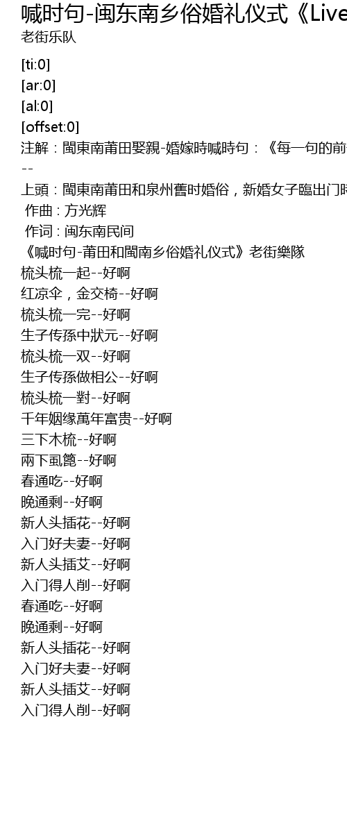 | [00:03.67] | 《喊时句-莆田和閩南乡俗婚礼仪式》老街樂隊 |