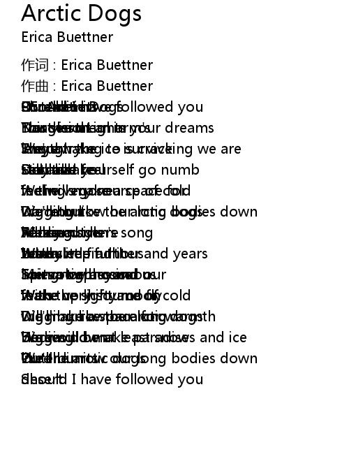 | 5. Arctic Dogs Outer limits Pure desert Should I have followed you For the Northern Lights You see them in your dreams This vision Dangles at an arm' s length Stay awake We' re trying to survive Though the ice is cracking we are still alive Stay awake Don' t let yourself go numb Feel and feel Until all feeling' s gone In the very source of cold We will make a space for warmth Digging like the arctic dogs We' ll burrow our long bodies down We' re out here For beauty Alluring siren' s song We' re out here For symbols Milk and honey Just a little further When we find it We' ll sleep a thousand years Let our hair grow around us Spin a tight cocoon Metamorphosis To evolve beyond our fears Wake up light and fly With the shifty moon In the very source of cold We will make a space for warmth Digging like the arctic dogs We' ll burrow our long bodies down Here will be at least snows and ice We would make paradise Digging like the arctic dogs We' ll burrow our long bodies down Outer limits Pure desert Should I have followed you |