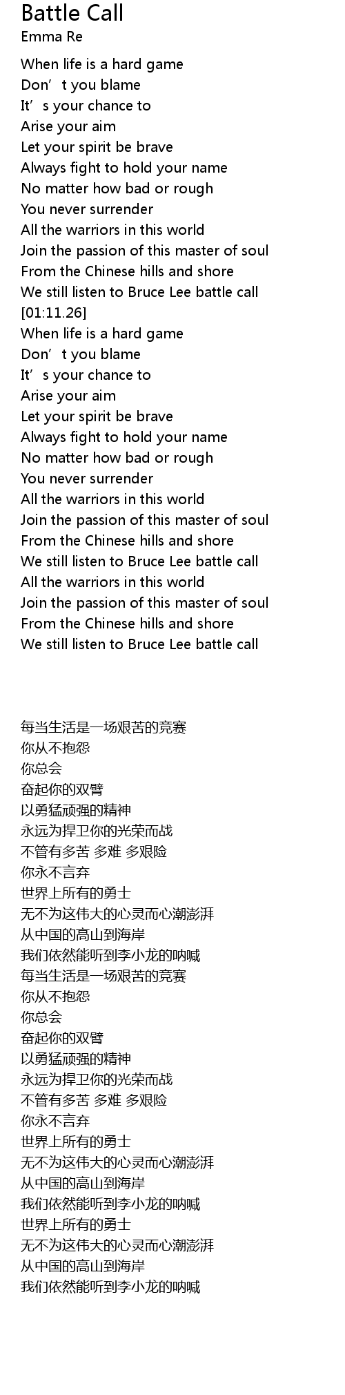| [01:59.05] | We still listen to Bruce Lee battle call |