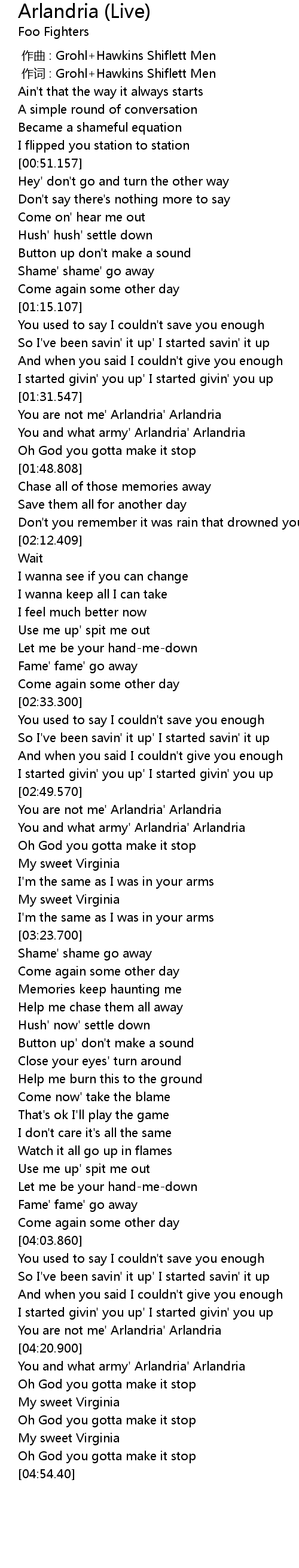 | [00:01.00] | 作词 : Grohl+Hawkins Shiflett Men |
