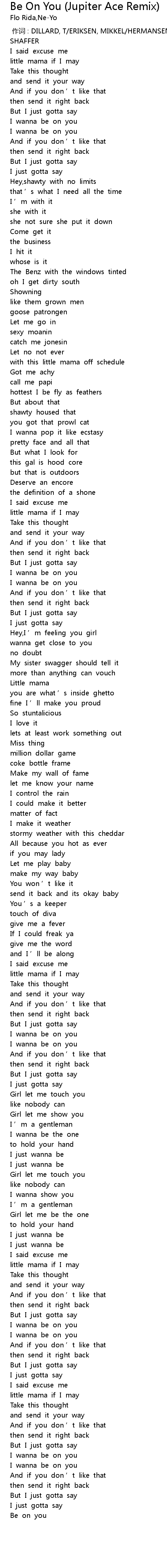 | [00:00.00] | 作词 : DILLARD, T/ERIKSEN, MIKKEL/HERMANSEN, TOR ERIK/SMITH, SHAFFER |
