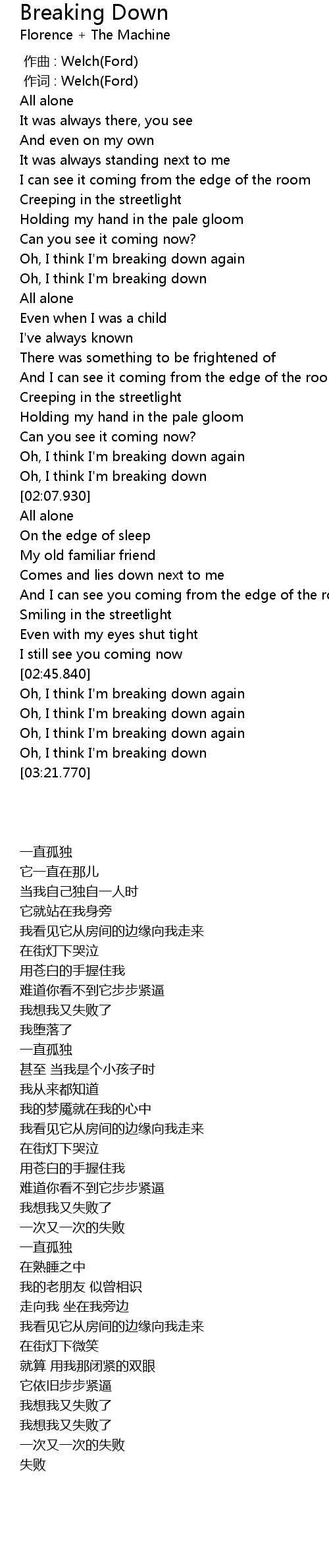 | [02:47.380] | Oh, I think I' m breaking down again |