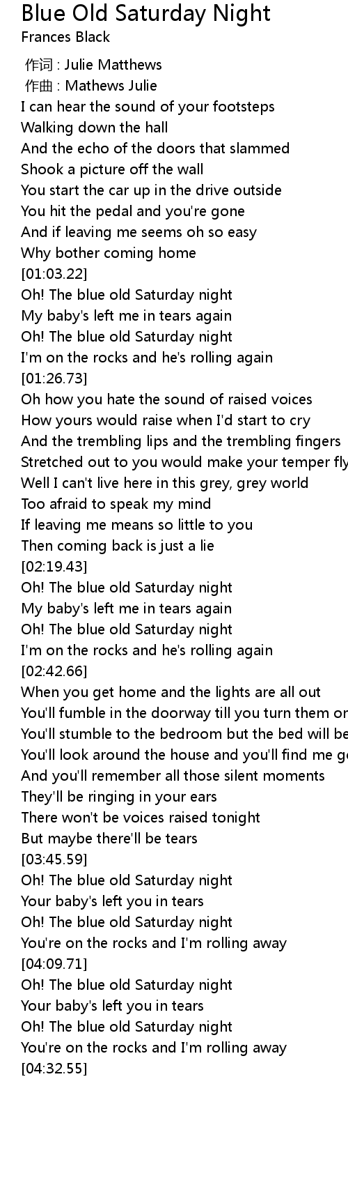| [04:22.18] | Oh! The blue old Saturday night |