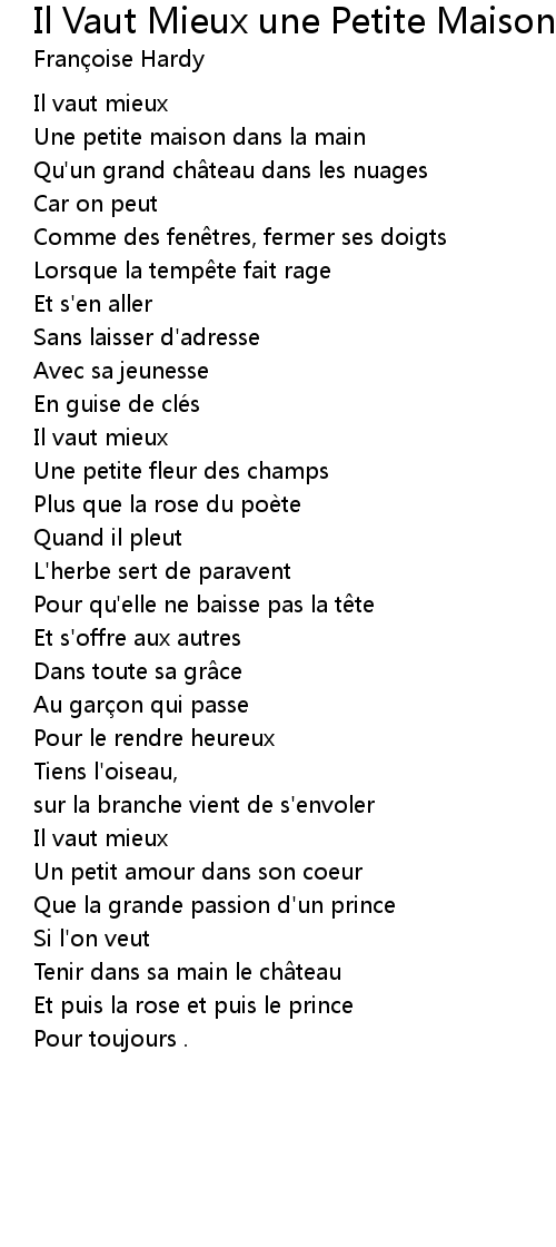 | Song | Il Vaut Mieux une Petite Maison Dans la Main Qu'un Grand Château ... |