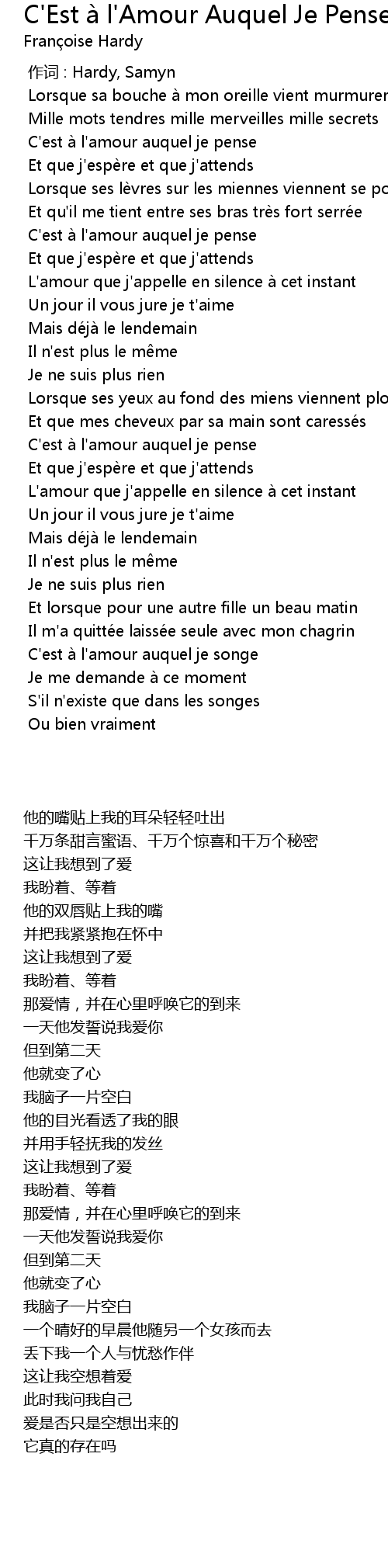| [00:25.533] | C' est a l' amour auquel je pense |