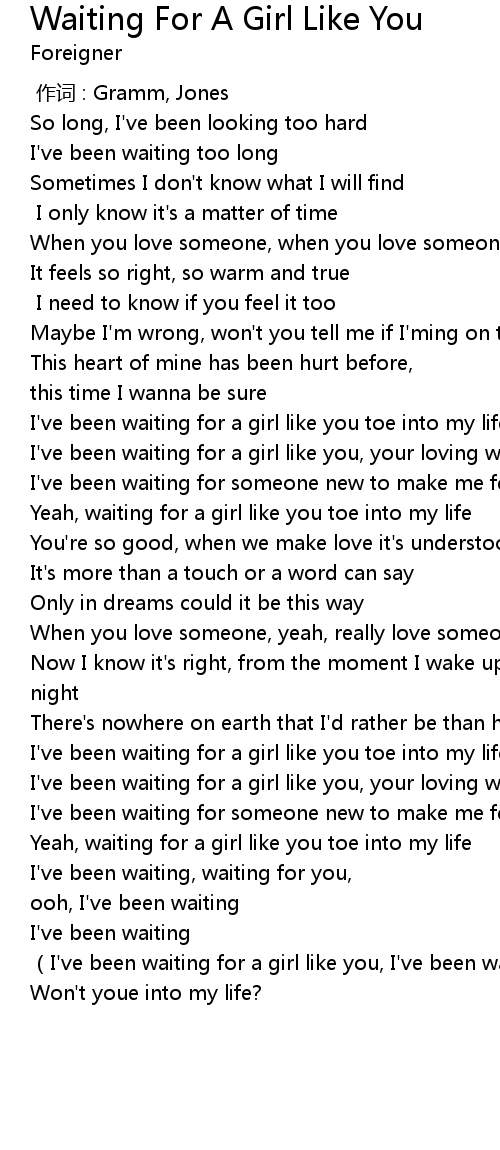 | [04:27.00] | I' ve been waiting for a girl like you, I' ve been waiting |