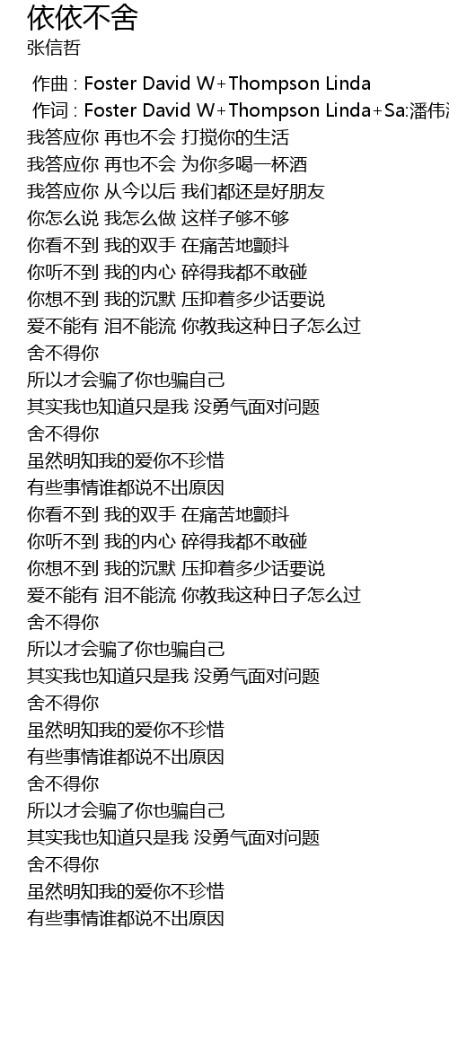 | [00:01.00] | 作词 : Foster David W+Thompson Linda+Sa:潘伟源 |