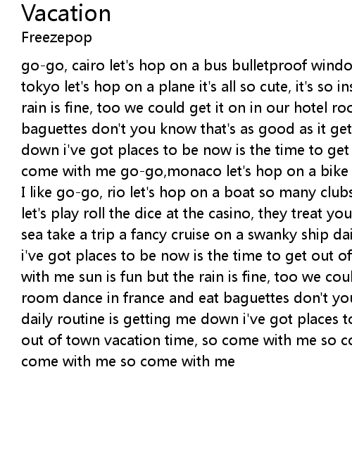 | I like go-go, rio let's hop on a boat so many clubs, let's put it to vote. okay, let's play roll the dice at the casino, they treat you nice let's flee to the sea take a trip a fancy cruise on a swanky ship daily routine is getting me down i've got places to be now is the time to get out of town vacation time, so come with me sun is fun but the rain is fine, too we could get it on in our hotel room dance in france and eat baguettes don't you know that's as good as it gets daily routine is getting me down i've got places to be now is the time to get out of town vacation time, so come with me so come with me so come with me so come with me so come with me |