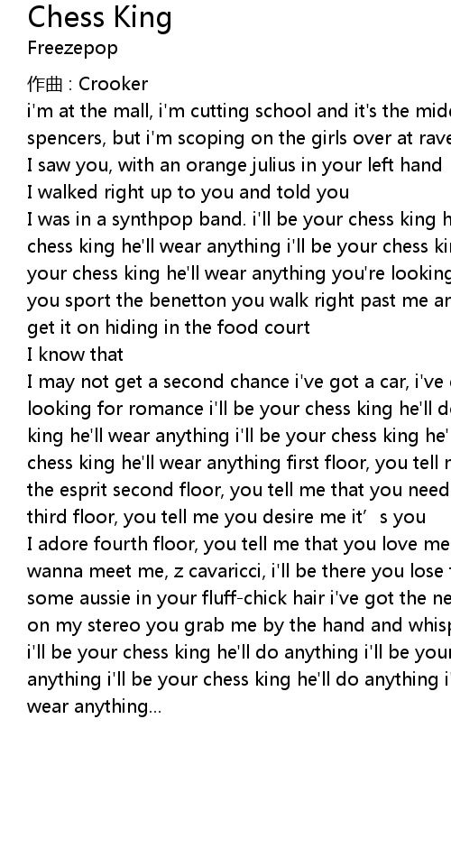 | I was in a synthpop band. i' ll be your chess king he' ll do anything i' ll be your chess king he' ll wear anything i' ll be your chess king he' ll do anything i' ll be your chess king he' ll wear anything you' re looking sassy and you know it cause you sport the benetton you walk right past me and don' t show it but you want to get it on hiding in the food court | |
