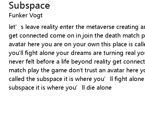 | let' s leave reality enter the metaverse creating an avatar for your new life get connected come on in join the death match play the game don' t trust an avatar here you are on your own this place is called the subspace it is where you' ll fight alone your dreams are turning real you feel so alive like you' ve never felt before a life beyond reality get connected come on in join the death match play the game don' t trust an avatar here you are on your own this place is called the subspace it is where you' ll fight alone this place is called the subspace it is where you' ll die alone |