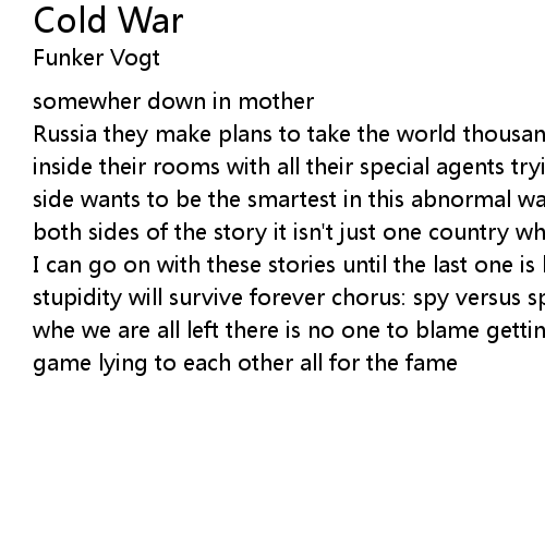 | Russia they make plans to take the world thousands of veiled secrets hidden deep inside their rooms with all their special agents trying to fool each other each side wants to be the smartest in this abnormal war but you always have to hear both sides of the story it isn't just one country which we have to blame | |
