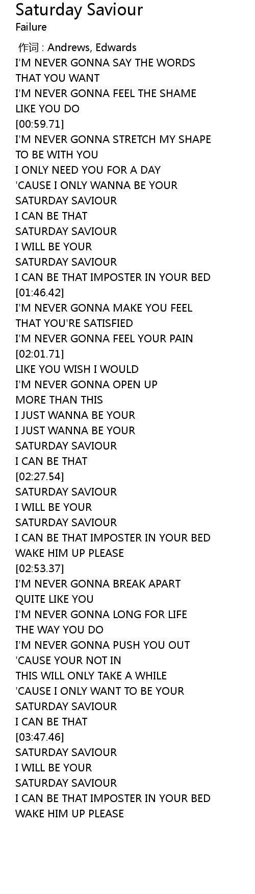 | [01:32.50] | SATURDAY SAVIOUR |