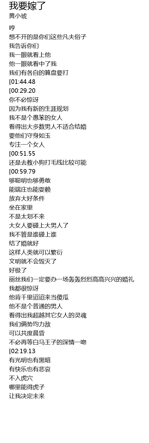 | [01:45.99][01:44.48][00:26.68][00:25.07] | 我要嫁了 |