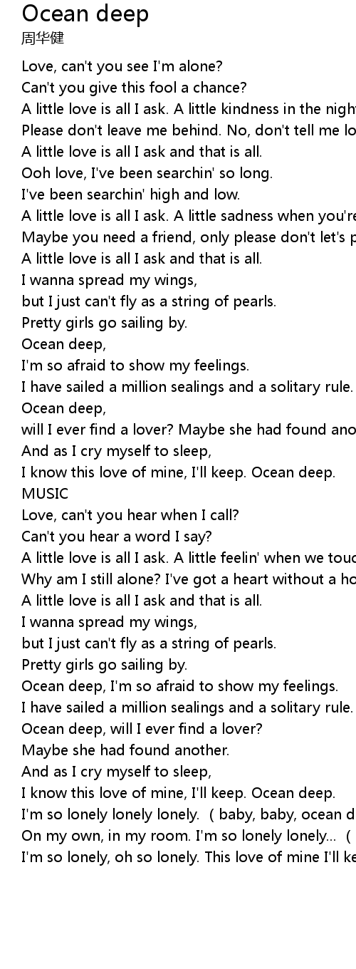 | [02:18.01] | I know this love of mine, I' ll keep. Ocean deep. |
