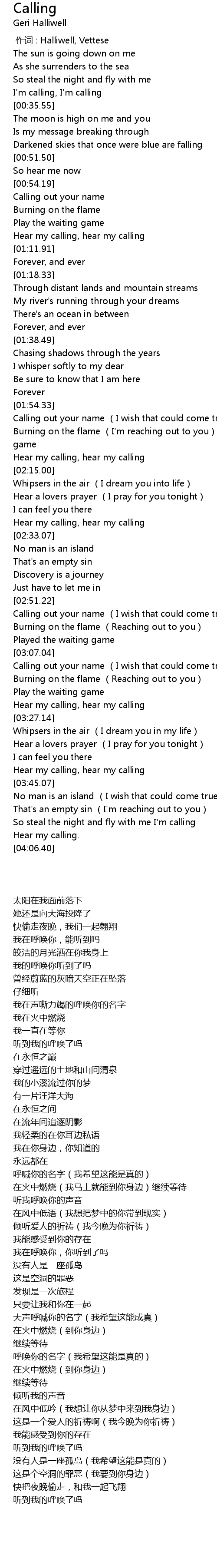 | [02:28.69] | Hear my calling, hear my calling |