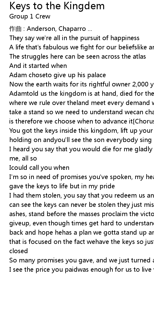 | I had them stolen, you say that you redeem us andbring us to a place where we can see the keys can never be stolen they just misplaced and so werise from the ashes, stand before the masses proclaim the victory is ours and so we never giveup, even though times get hard to understand, its never enough for us to sit back and hope hehas a plan we gotta stand up and face the cold with a boldness that is focused on the fact wehave the keys so just believe there' s nothing closed | |