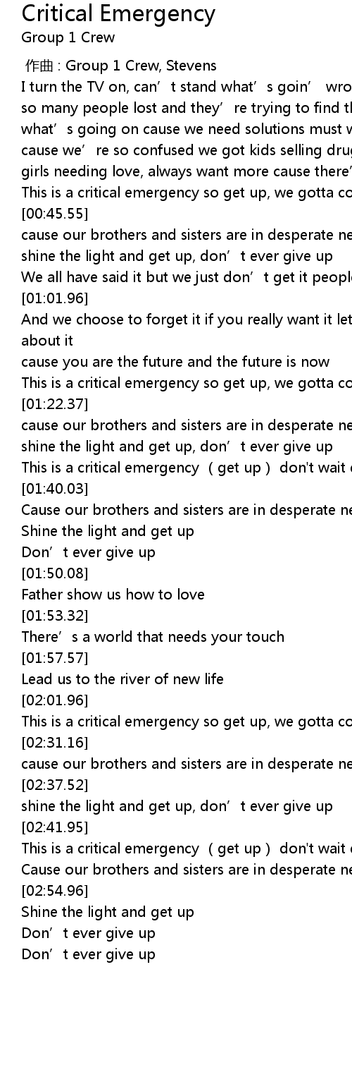 | [01:32.73] | This is a critical emergency (get up) don't wait don't hesitate |
