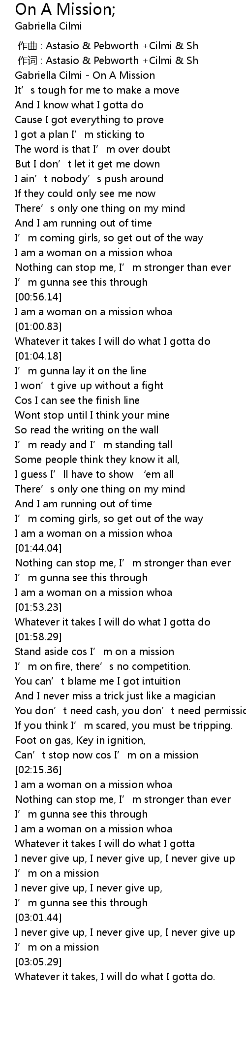 | [00:01.17] | Gabriella Cilmi - On A Mission |