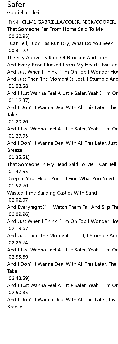 | [02:29.69] | And I Just Wanna Feel A Little Safer, Yeah I’m On My Knees |